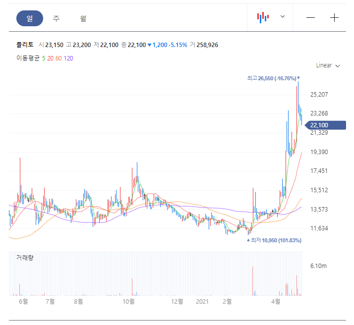 당일 마감 기준 플리토의 차트입니다. 4월 13일부터 15일간 미친듯한 상승을 겪고 조정 기간. 이후 4월 26일 다시 한번 급등을 겪고 조정 기간을 가지고 있습니다.