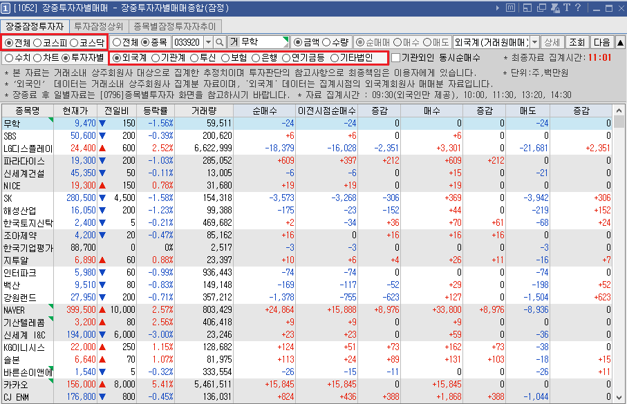장 중 실시간 수급을 확인하는 방법은 여러가지가 있어요. 금일은 개 중 1052 창을 띄워 확인하는 방법에 대해 살펴보도록 하겠습니다.