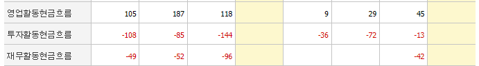 작년 삼원강재의 영업활동현금흐름과 투자활동현금흐름은 각각 (+)118억. (-)144억. 재무활동현금흐름도 (-)96억원으로 현금흐름 좋습니다.