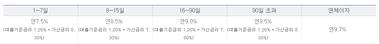 거래기간에 따라 이자율이 다르죠?. 1-7일간은 연 7.5% / 8-15일간은 연 8.5% / 16-90일간은 연 9.0% / 90일을 초과했을 경우엔 연 9.5%입니다. 이자율이 두 자리 숫자가 아니라서 낮아보이죠?. 아닙니다.