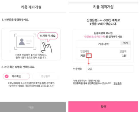 준비한 신분증 (주민등록증 또는 운전면허증) 으로 촬영도 하고 1원 입금으로 본인 계좌 여부 확인도 하구요