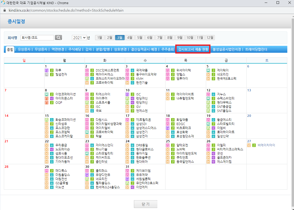 ▲ 증시일정을 클릭했다면 위와 같은 창이 나타날겁니다. 빨간색 네모칸 안의 감사보고서 제출 현황을 꾸욱 눌러주세요.